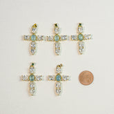 Sublimes breloques travaillées en forme de croix en Aigue-marine, laiton plaqué or 18k 1 micron et oxyde de zirconium transparent de 39 x 25 x 4,5 mm, attache de 6 x 4 mm.