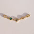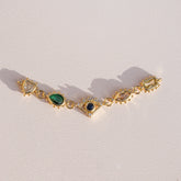 Breloque connecteur maillée avec oeil en zirconium bleu nuit au centre, puis goutte vert, coeur transparent, ovale rose pêche, rectangle jaune.