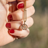 La pierre fait 10,5 mm de diamètre et 4,5 mm d'épaisseur, le pendentif mesure 16,5 mm de haut en avec l'attache, trou de 3,5 mm.