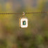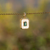 Breloques forme rectangle en nacre naturelle, laiton plaqué or 18k et cabochon en oxyde de zirconium vert Émeraude de 20 x 14 x 3,5 mm, anneau avec zirconium transparents de 4 mm, vendues à l'unité.