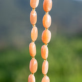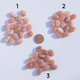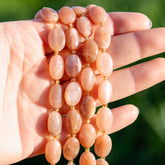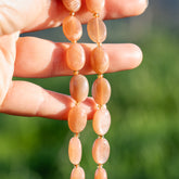 Perles ovales lisses de Pierre de lune rose/pêche de env 14 mm de long, env 10 mm de large pour env 6 mm d'épaisseur, trou de env 1 mm, vendues à l'unité.