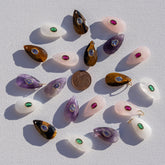 Vous avez le choix entre : Améthyste avec zirconium lilas, Cristal de roche ( opaque ) avec zirconium vert Émeraude, Oeil de tigre avec zirconium lilas ou Quartz rose avec zirconium rose vif.