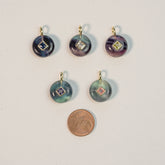 Sublimes pendentifs ronds lisses en laiton doré en Fluorite multicolore avec un charms losange en oxyde de zirconium collé au centre, vendus à l'unité.
