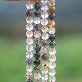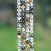 Pierre fine naturelle, non traitée, ce Quartz est fascinant ! Il s'agit d'un Quartz donc certaines perles sont hématoide ( ferrugineux/orangé ) avec des diverses inclusions : taches noires : chlorite, noir pailleté : graphite ( d'après mes recherches personnelles ), il y aussi des perles + translucides voir laiteuse, unique !