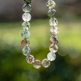 1/2 rang de env 19 cm de long et de env 23 perles rondes lisses de Quartz à inclusions vert de 8,5 mm, trou de env 0,9 mm.