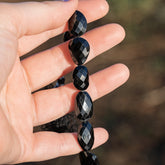 Perles pépites aplaties à facettes de Spinelle noire de taille comprise entre 16 et 18,5 mm de haut, trou de env 0,4/0,5 mm : attention certaines perles ne passent pas avec un clou en 0,5 mm, il vous faudra plus petit, concernant le fil cablé, c'est ok avec du 0,38 mm.