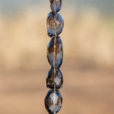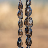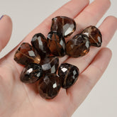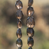 Grosses perles pépites à facettes de quartz fumé de taille comprise entre 18 et 27 mm de haut, trou de env 0,7 mm, poids de env 4 à 11 grammes.