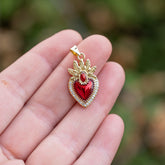 Breloques émaillées rouge Ex Voto en laiton plaqué or 18k 1 micron et oxyde de zirconium transparent de 25,5 x 14 x 4 mm, attache de 5 x 4 mm.
