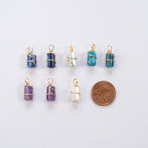 Breloques en forme de colonnes dans 4 pierres au choix en cuivre plaqué or 14k torsadés, la taille est de env 15/17 mm de long en tout, de env 6/7 mm de large, la boucle fait 3,5 mm du diamètre, vendues à l'unité.