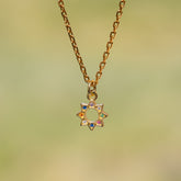 Breloques forme soleil en laiton plaqué or 18k et oxyde de zirconium multicolores de 12 x 10 x 2 mm, anneau de 5 x 0,9 mm, vendues à l'unité.