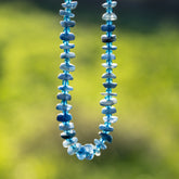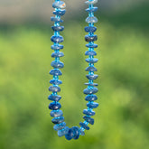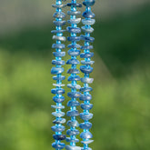 Rang de env 40 cm de long ( avec les perles plastiques ) et env 88 perles pépites rondelles plates de Cyanite bleue de env 7,5 mm de large pour env 1,2/35 mm d'épaisseur, trou de env 0,8 mm.