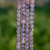 Rang de env 37 cm et de env 46 perles rondes lisses en Améthyste violet clair ( provenance Brésil ) de 8,5 mm, trou de env 0,9/1 mm.